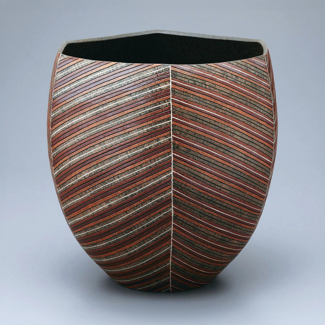 Inlay (zōgan) ceramics are created by making incisions on the surface of a piece which are then filled with a differently colored clay to create a design. After the clay is inlaid, a glaze is applied and the piece is completed upon firing.