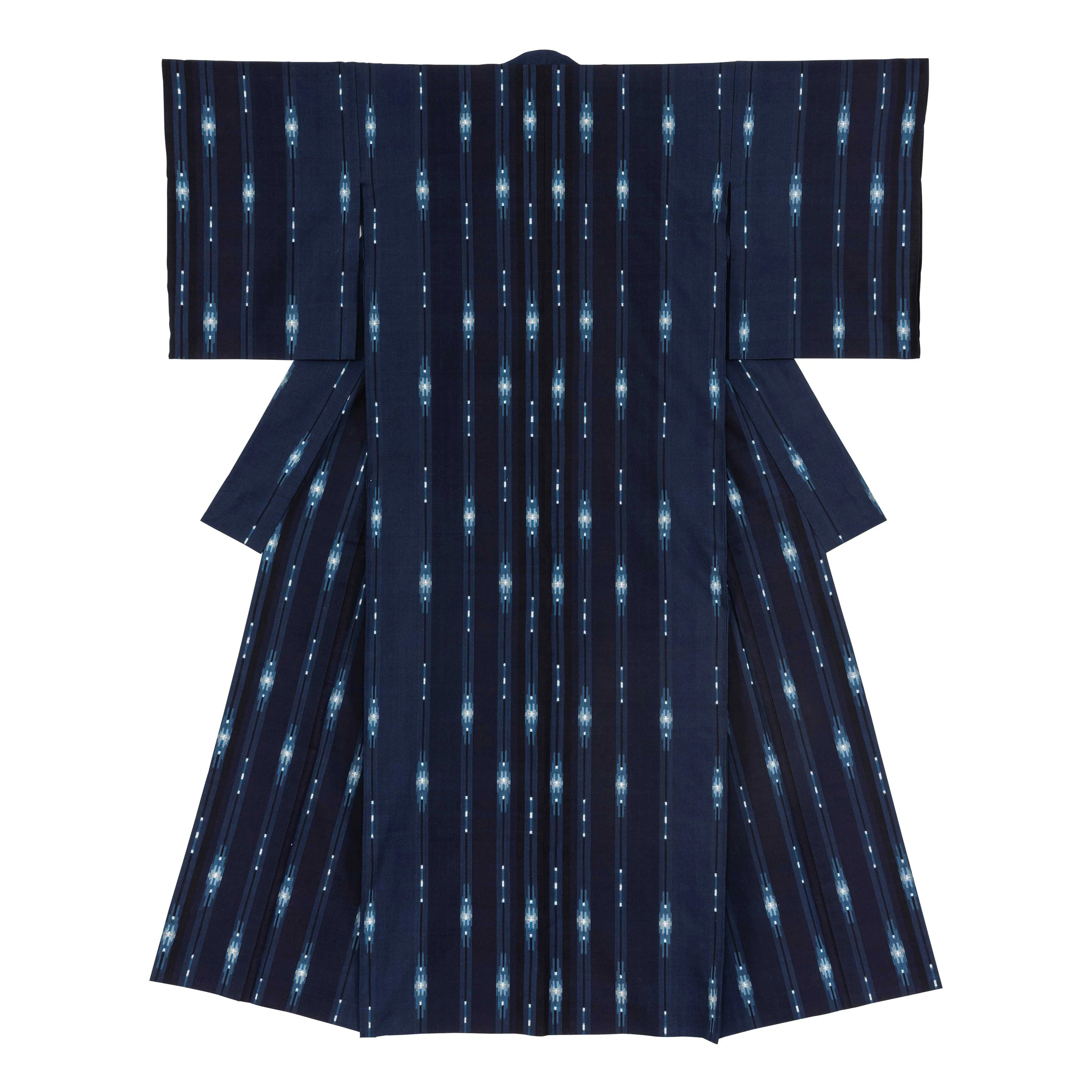 Kurume kasuri is a type of ikat woven fabric produced near Kurume in Fukuoka prefecture. An artisan first creates a fabric design and then resist-dyes bundles of threads, tying them in special arrangements (kasuri kukuri) to create white-reserve patterns on the dyed thread. The individual threads are then woven together to create the final design, producing motifs with characteristically blurry edges. Kurume kasuri is a nationally designated Important Intangible Cultural Property.