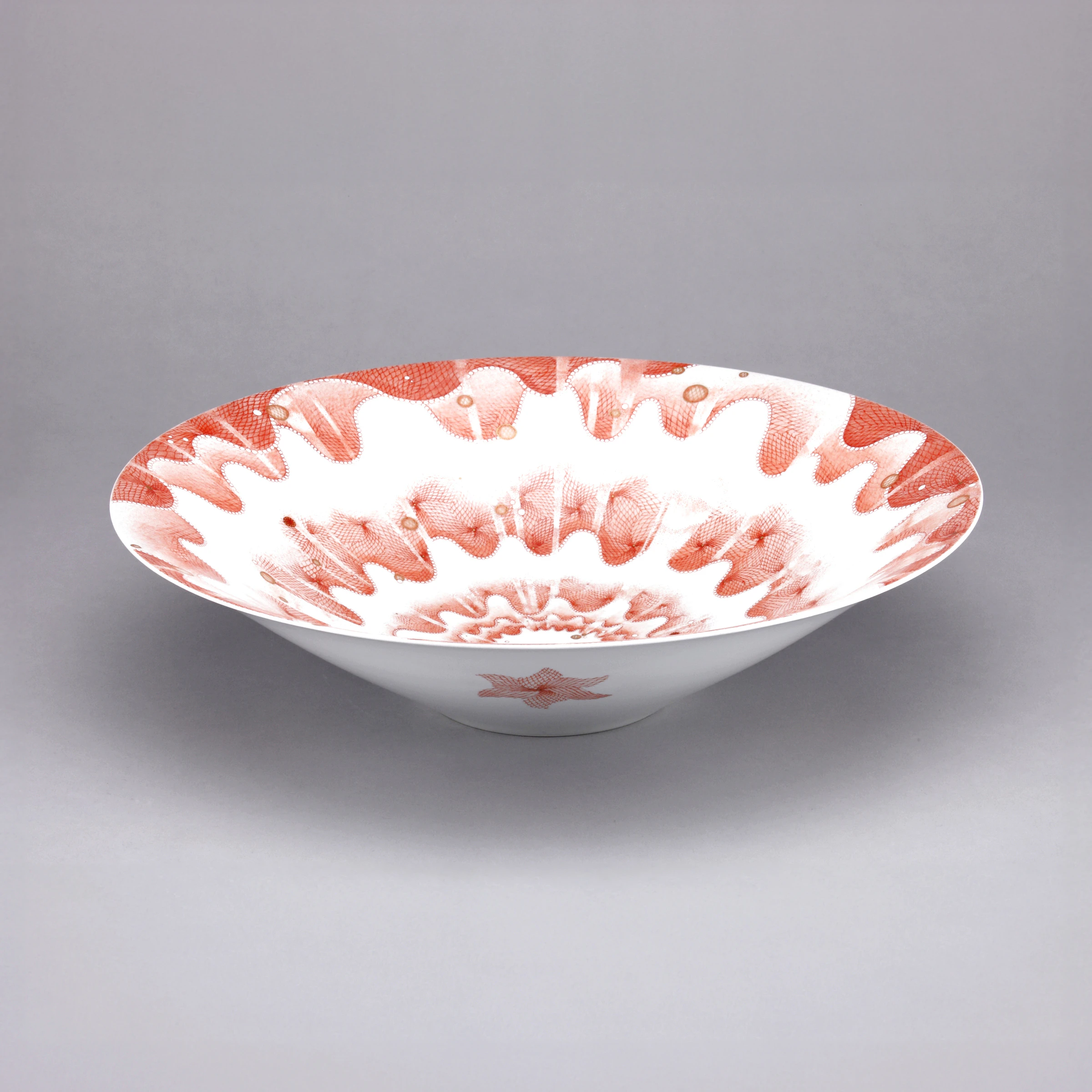 Overglaze enamel decorations (iro-e, literally “colored pictures”) are achieved by applying designs to the surface of already glazed and fired porcelain. The decorations are painted over the glaze, and the piece is fired again at a low temperature of approximately 800℃. The pigments used in traditional overglaze decorations are known as wa enogu (“Japanese paints”) and offer a palette of colors such as red, blue, yellow, green, and purple. Overglaze enameling may also be done with Western pigments (yō enogu).