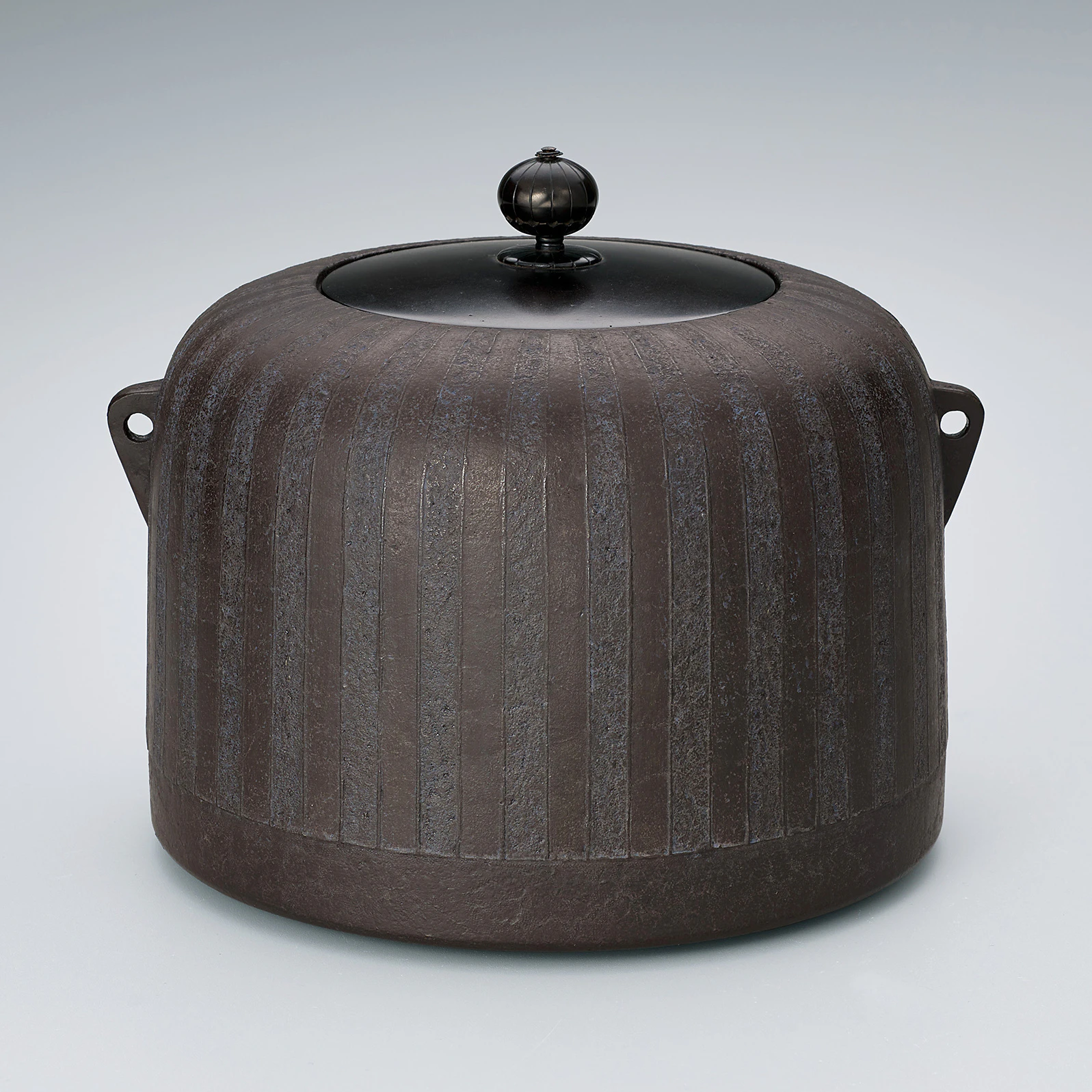 In clay mold casting (sōgata), a symmetrical mold is produced by rotating a template called a strickle board in a mixture of sand and clay to shape the walls of the mold. Clay mold casting is predominantly used to produce tea ceremony kettles and temple bells. After the piece is removed from the mold, it is heated and painted with lacquer (urushi) or a solution of iron, vinegar, and alcohol known as ohaguro (“teeth blackening liquid”) to produce a unique, dark finish.