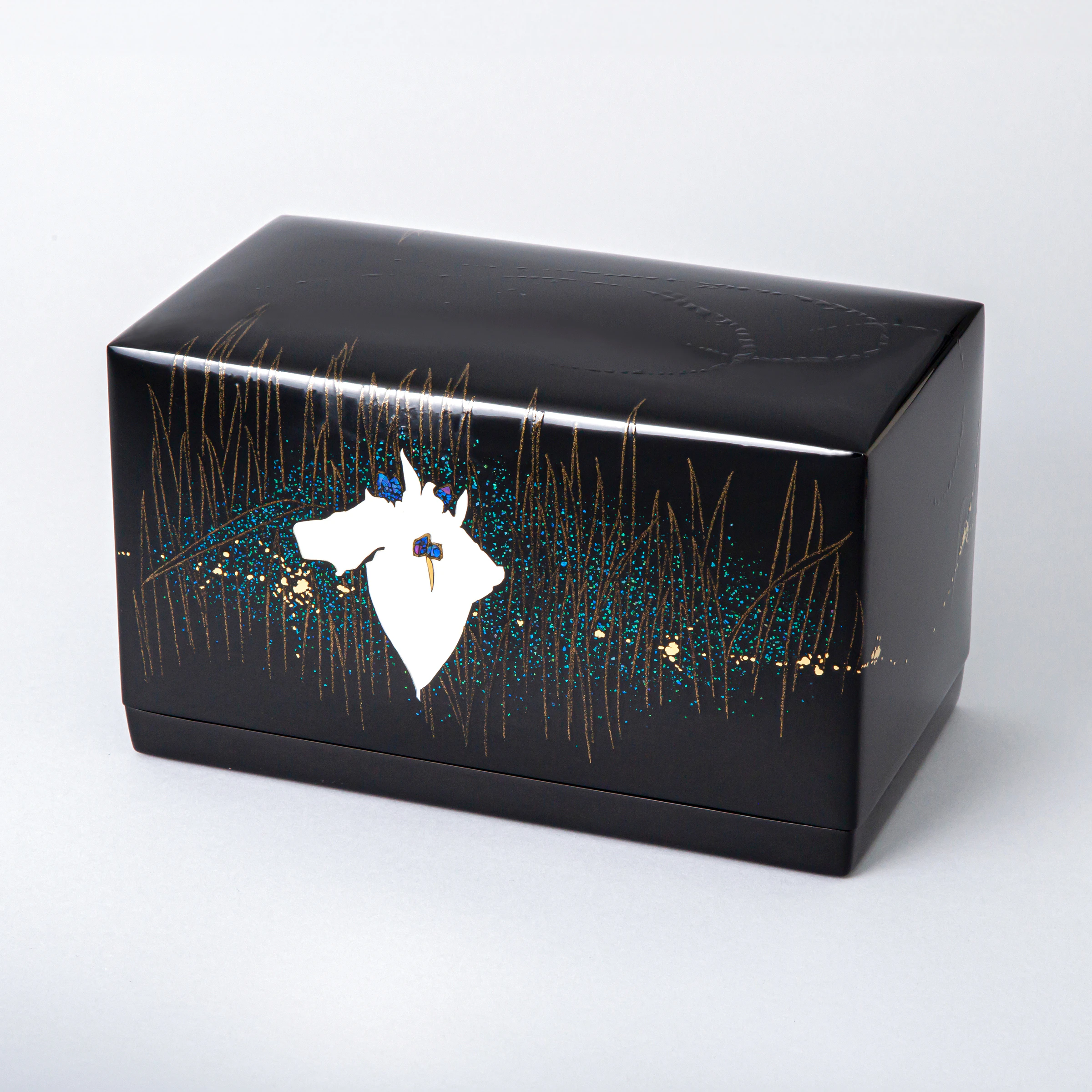 Maki-e (literally “sprinkled pictures”) is a representative lacquerware technique that originated in Japan around 1,200 years ago. Maki-e is done by painting lacquer motifs on the surface of a piece using a fine brush and then sprinkling gold powder onto the lacquer before it hardens, producing luxurious decorations.