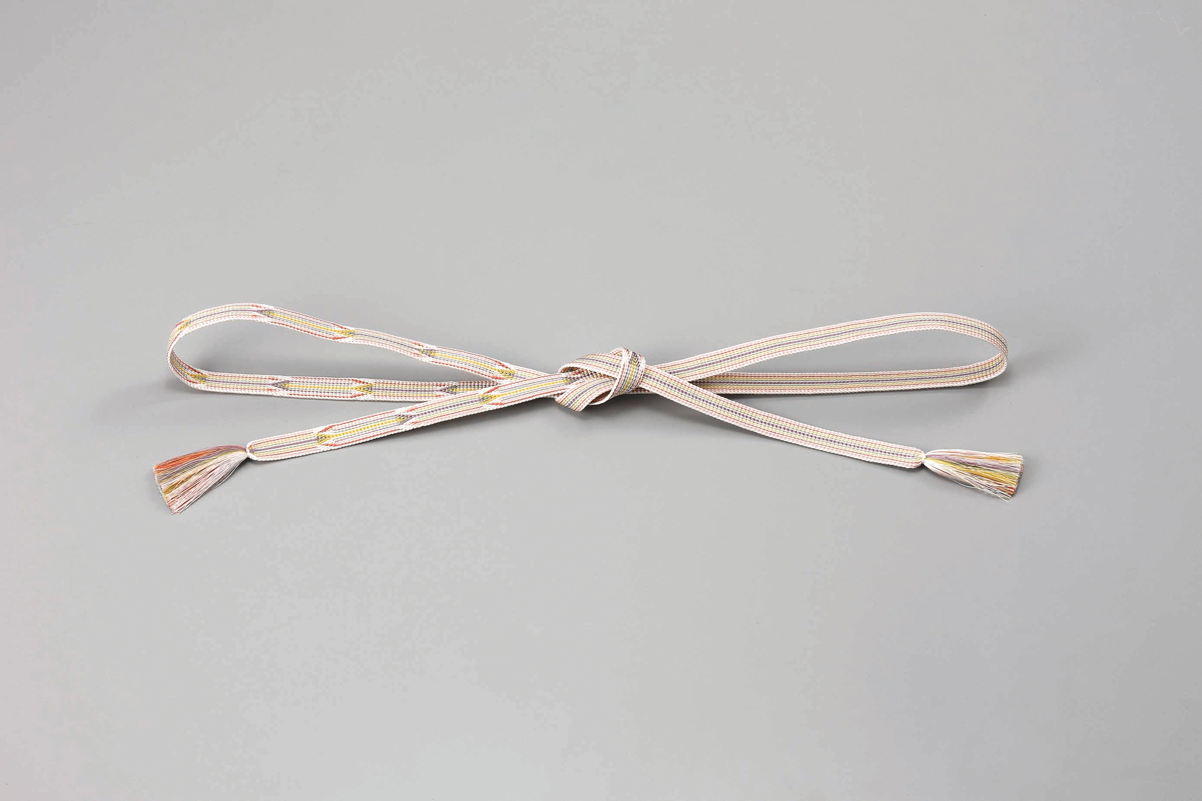 Kumihimo braided cords are made by gathering dozens of threads into separate bunches and then braiding the bunches together into a single cord. For centuries, kumihimo cords have been important articles for tying and binding. Today, kumihimo cords of many different patterns are worn with kimono as obi jime (a decorative girdle tied around the obi of the kimono).
