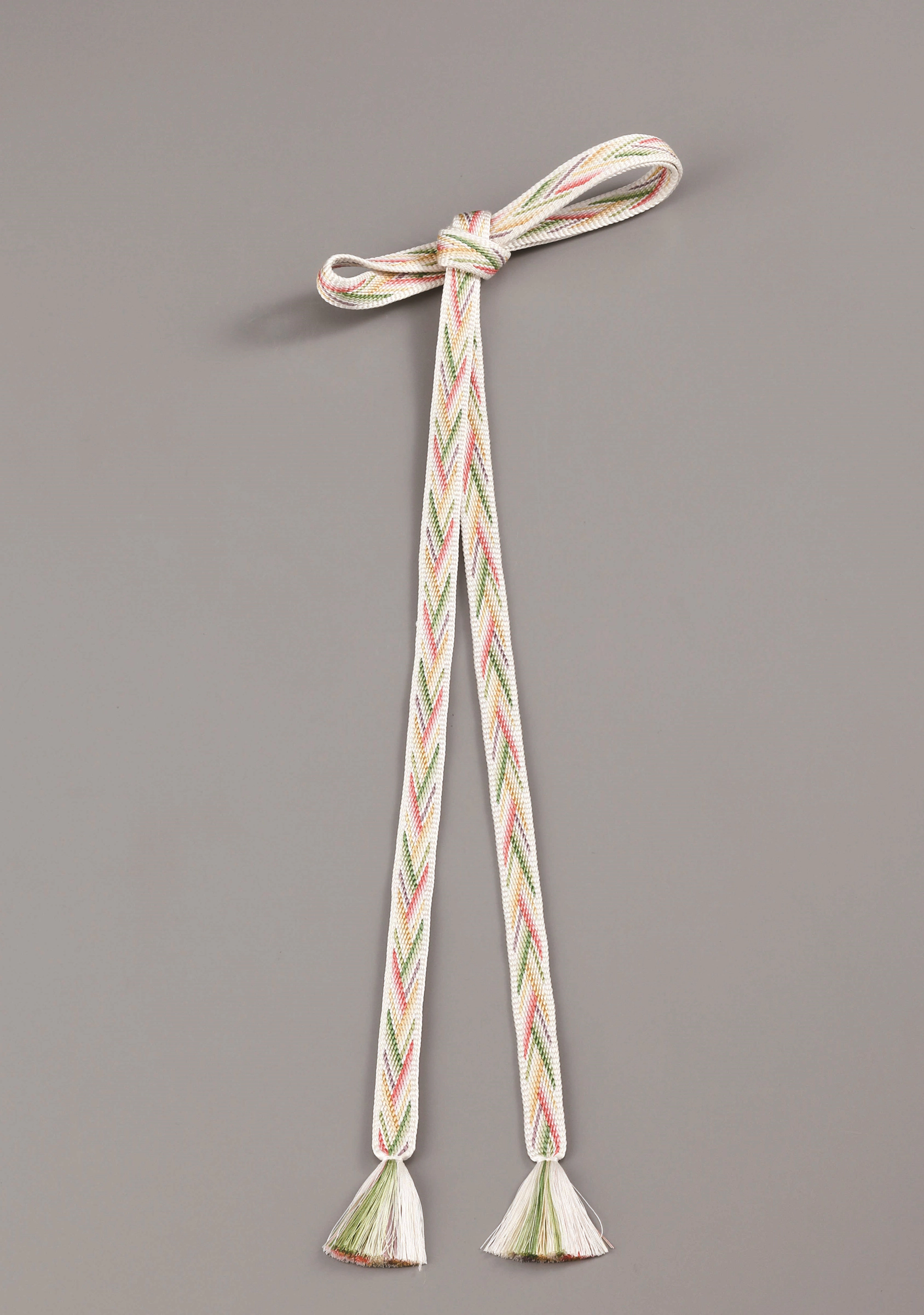 Kumihimo braided cords are made by gathering dozens of threads into separate bunches and then braiding the bunches together into a single cord. For centuries, kumihimo cords have been important articles for tying and binding. Today, kumihimo cords of many different patterns are worn with kimono as obi jime (a decorative girdle tied around the obi of the kimono).