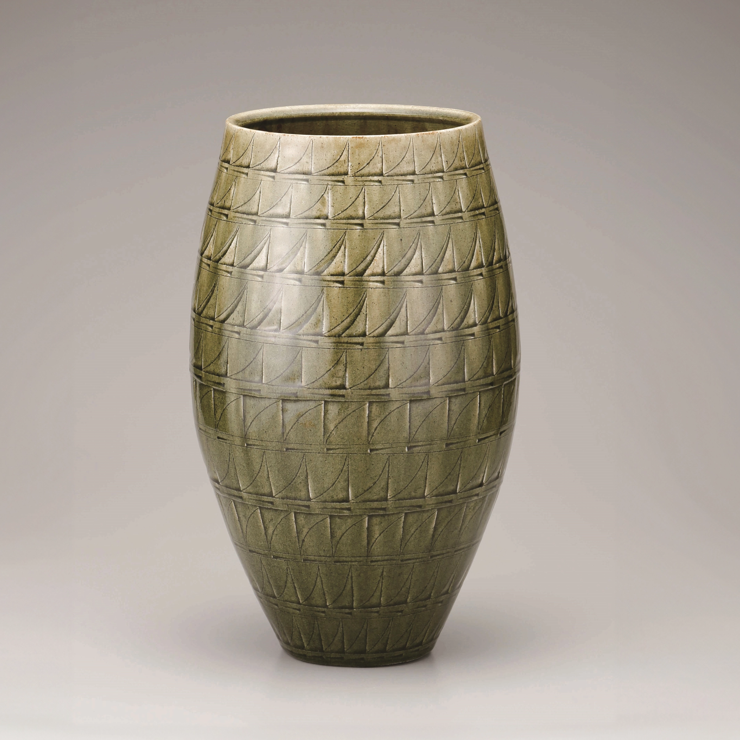 Flower Vessel with Ash Glaze and Curved Line in Engraving