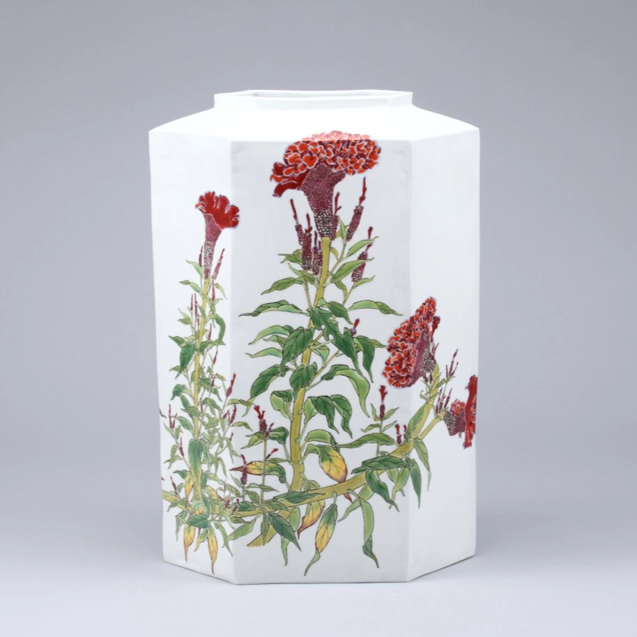 下絵鶏頭象埋色絵六角瓶 Kenichi Naka