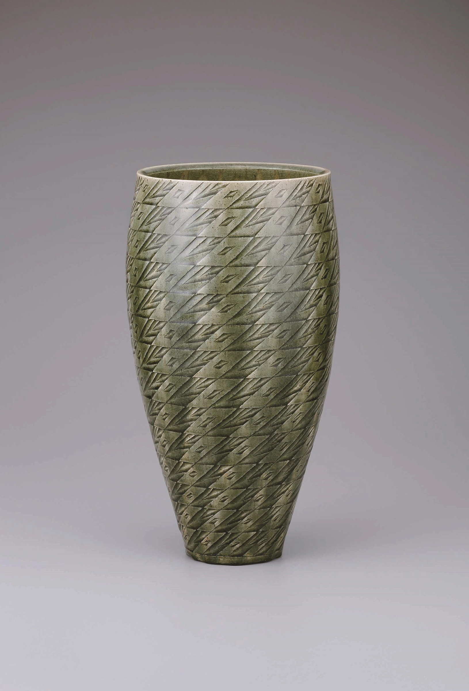 Flower Vessel with Ash Glaze and Curved Line in Engraving