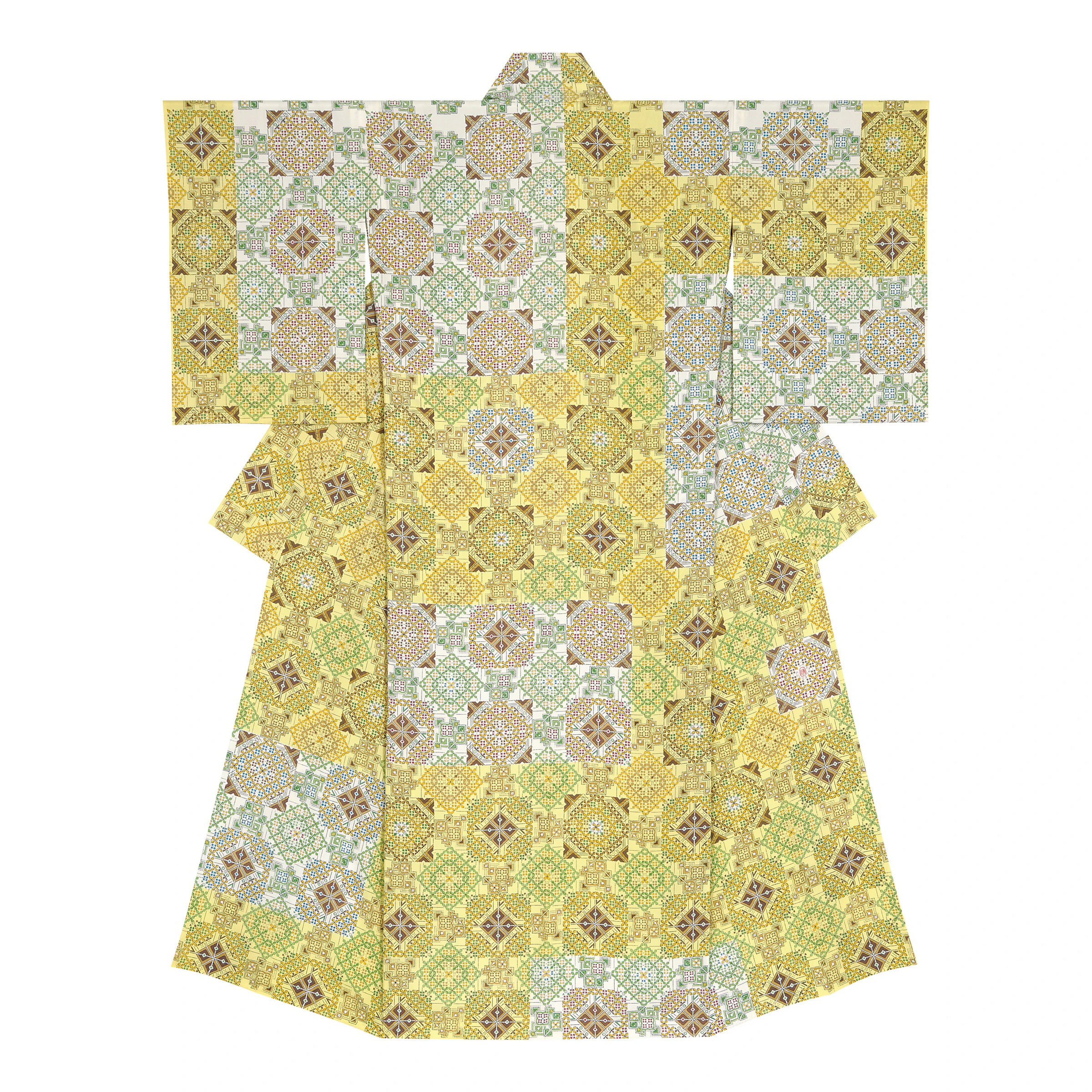 Kimono with sarasa pattern in woodblock printing. “Yūkei”
