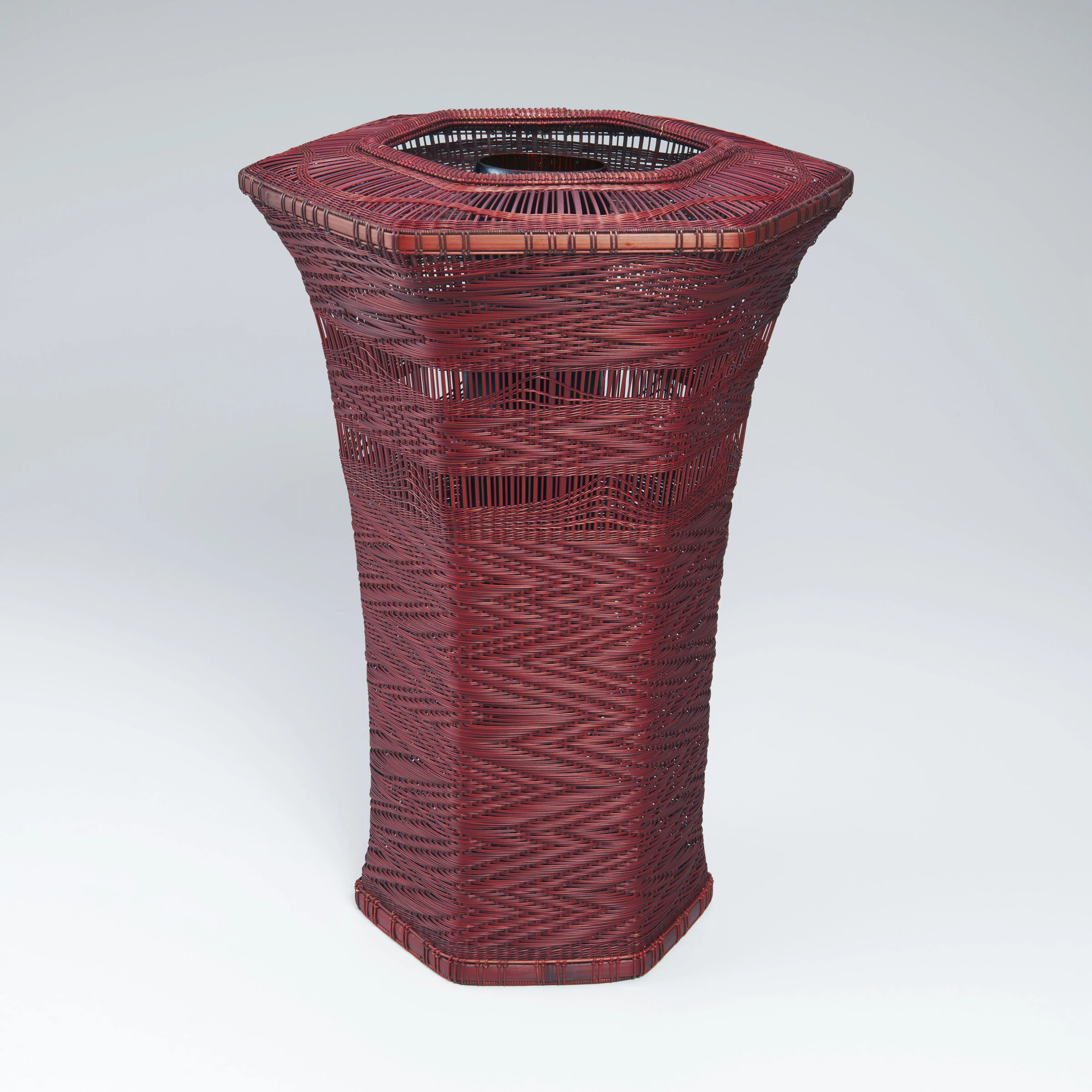 Plaited bamboo basketry (amimono) is created by weaving together hundreds of strips of bamboo into patterns known as plaiting (ami). Various patterns and shapes can be created by using bamboo strips of different widths or thicknesses. The many styles of plaiting utilize bamboo’s pliability to produce beautifully patterned works.