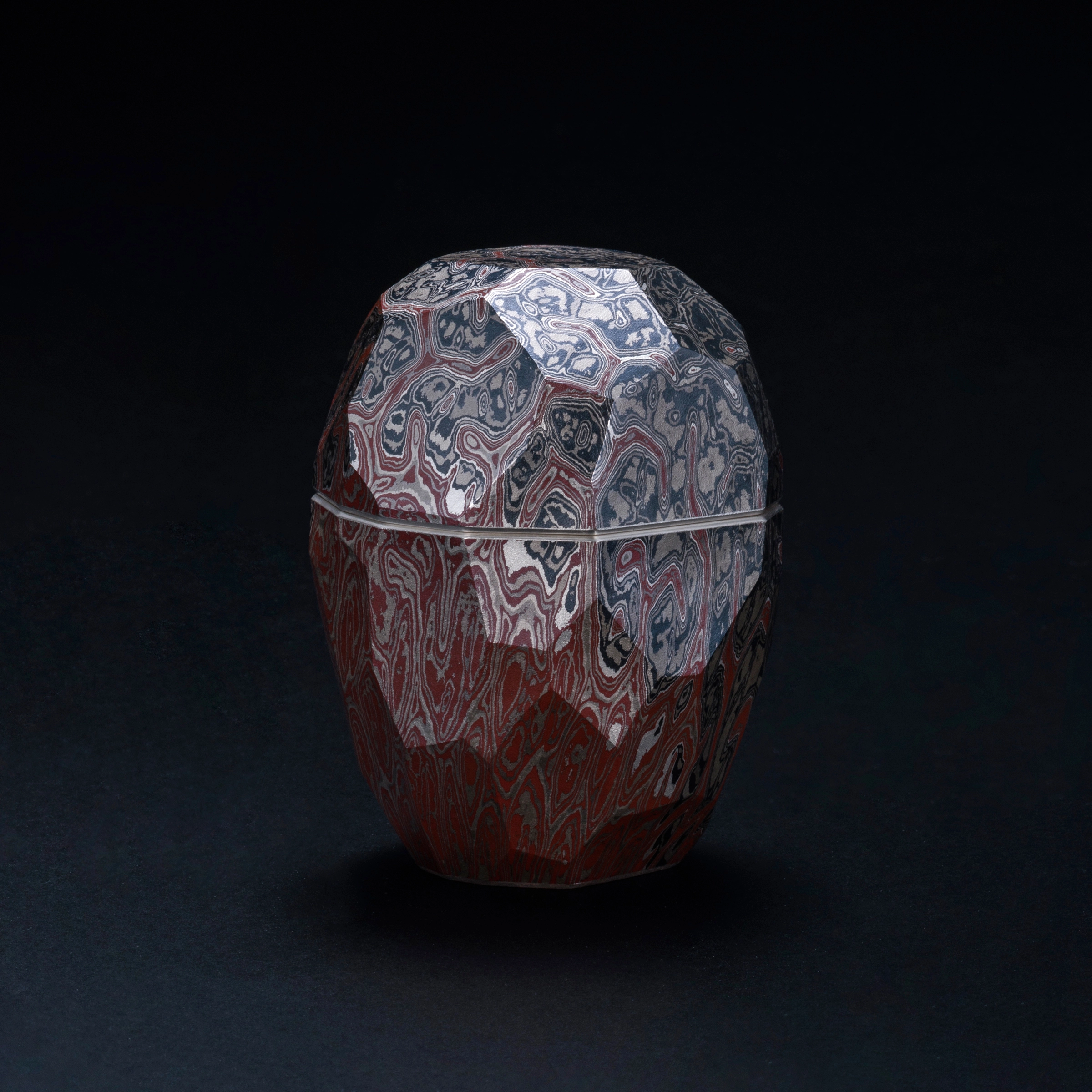 Mokumegane (“wood-grain metal”) is a decorative metal laminate characterized by polychromatic wood-like grain patterns. The pattern is made by soldering together sheets of different metals to form a layered billet that is then hammer worked and cut to reveal the pattern. The metal may then be further worked to create objects with the unique patterning.