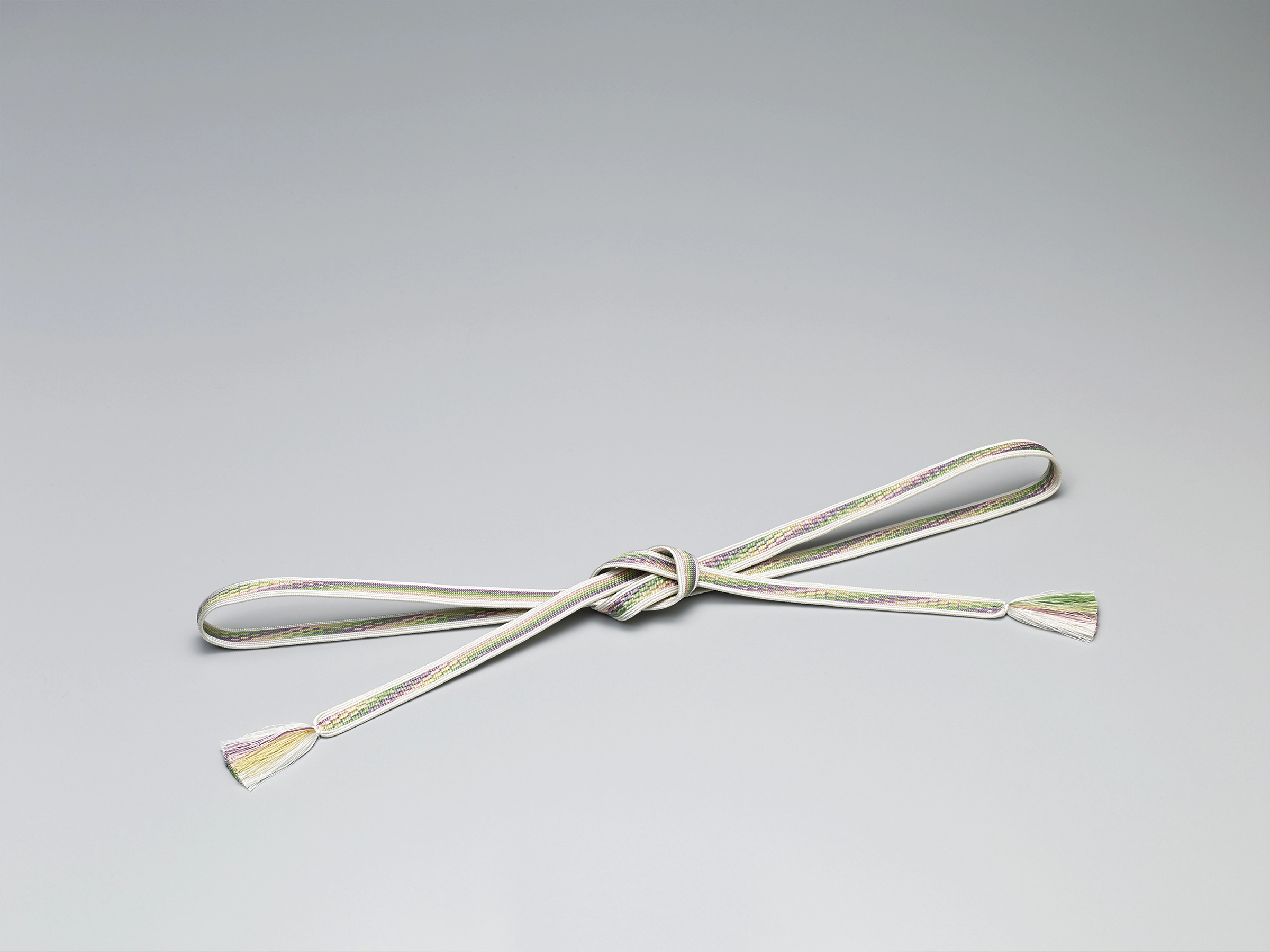 Kumihimo braided cords are made by gathering dozens of threads into separate bunches and then braiding the bunches together into a single cord. For centuries, kumihimo cords have been important articles for tying and binding. Today, kumihimo cords of many different patterns are worn with kimono as obi jime (a decorative girdle tied around the obi of the kimono).