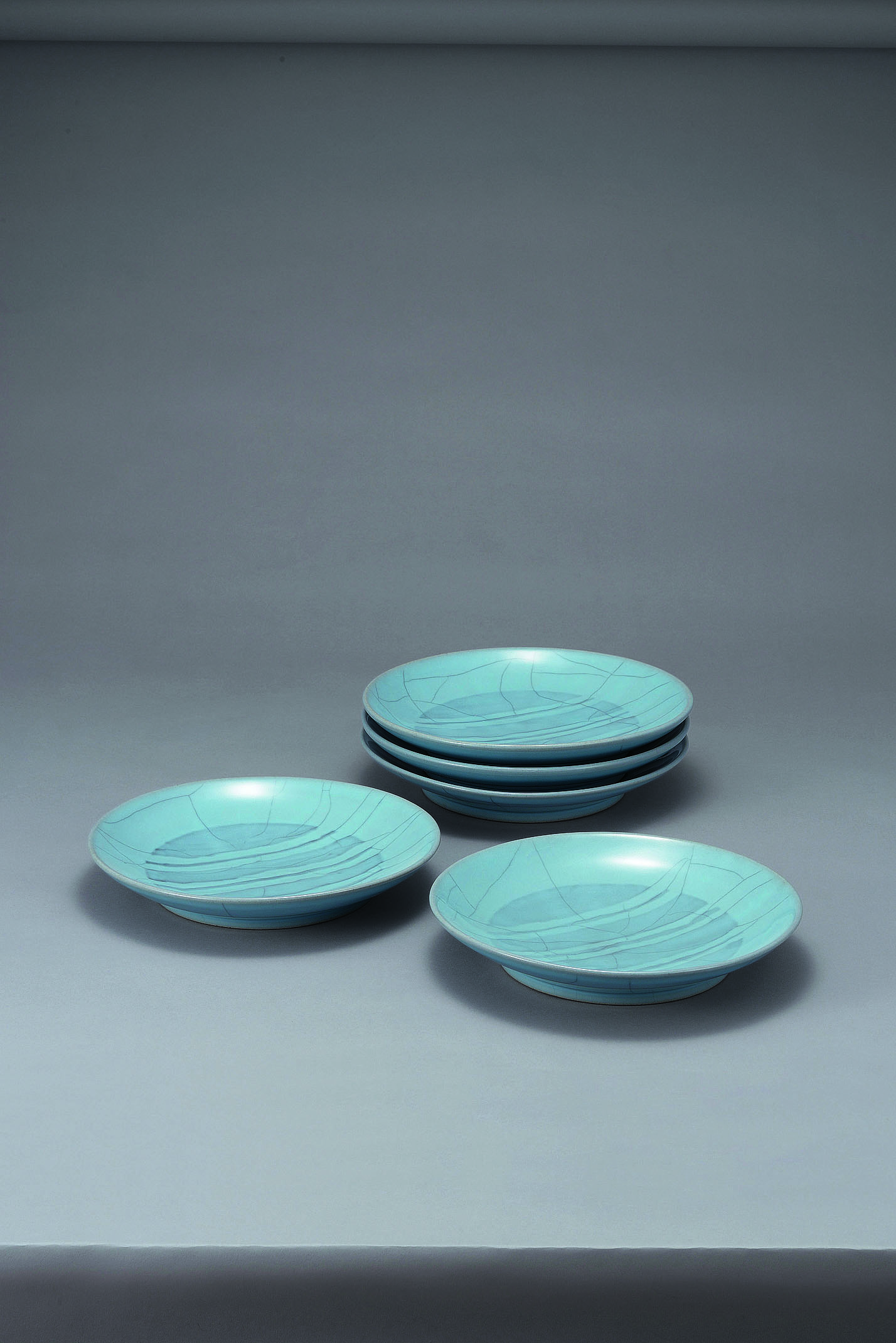 Celadon (seiji) is a light blue-green pottery, usually porcelain or stoneware, produced by reduction firing a transparent glaze containing iron oxide. By restricting or eliminating the supply of oxygen to the kiln, the reduction firing process causes the iron in the glaze to turn bluish-green.