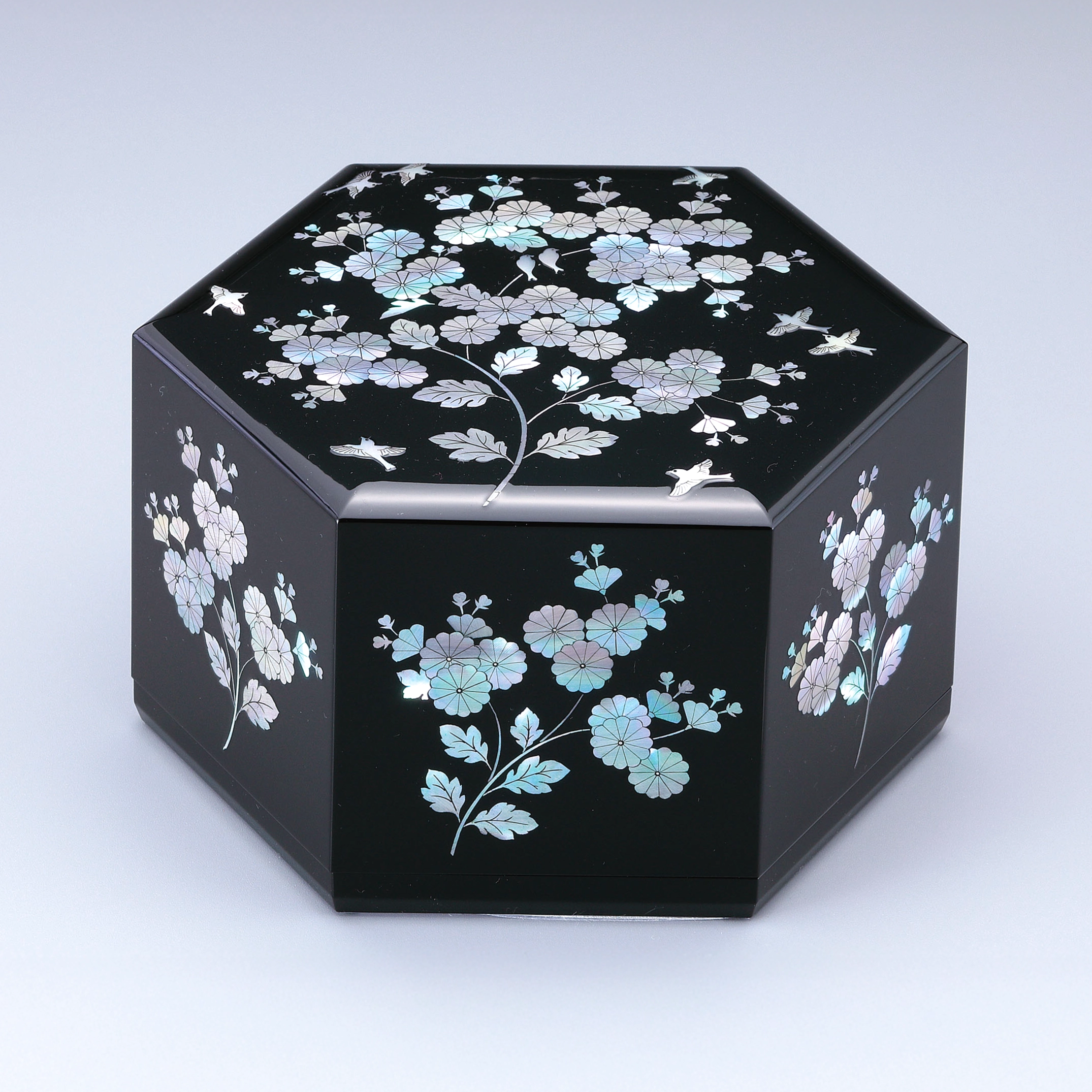 Mother-of-pearl inlay (Raden) is a decorative technique that uses the iridescent inner layer of abalone shell, turban shell, pearl oyster shell, or other mollusk shells. The technique came to Japan from China 1,300 years ago, and pieces featuring mother-of-pearl inlay are included among the artifacts at the Shōsōin Repository in Nara.