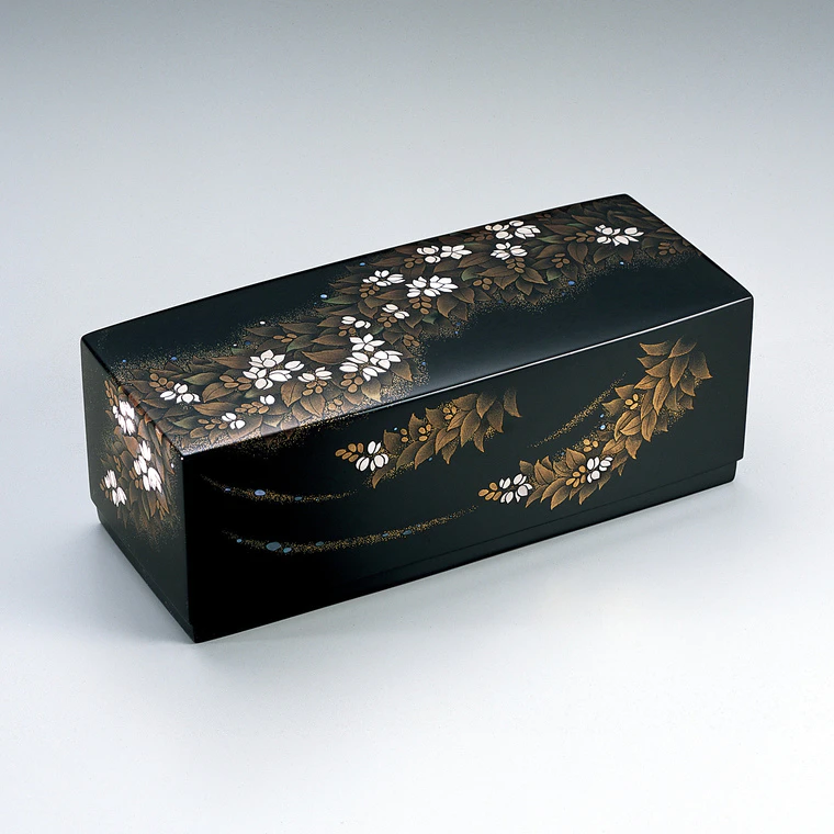 蒔絵は日本独自に発達した漆芸の代表的な技法で1200年ほど前から行われています。器の表面に細い筆を使って漆で絵を描き、その漆が固まらないうちに上から金の粉を蒔きつけて模様をあらわします。