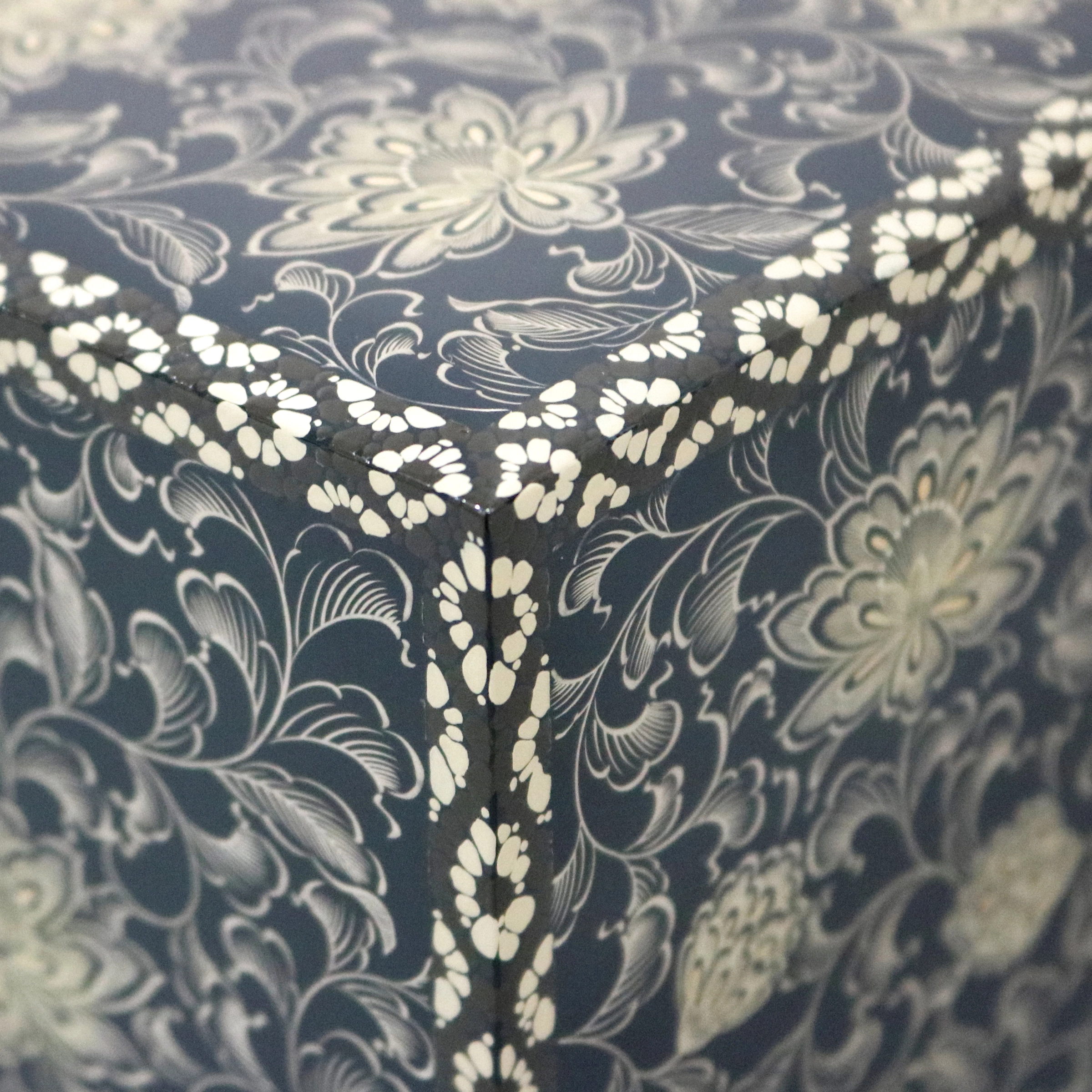 黒塗や朱塗の塗地に宝相華は以前にも描きましたが、青塗地はこだわりがあり、青塗地に白金、金で宝相華を表現することで黒地や朱塗地では表現できない凛とした宝相華になったように思います。