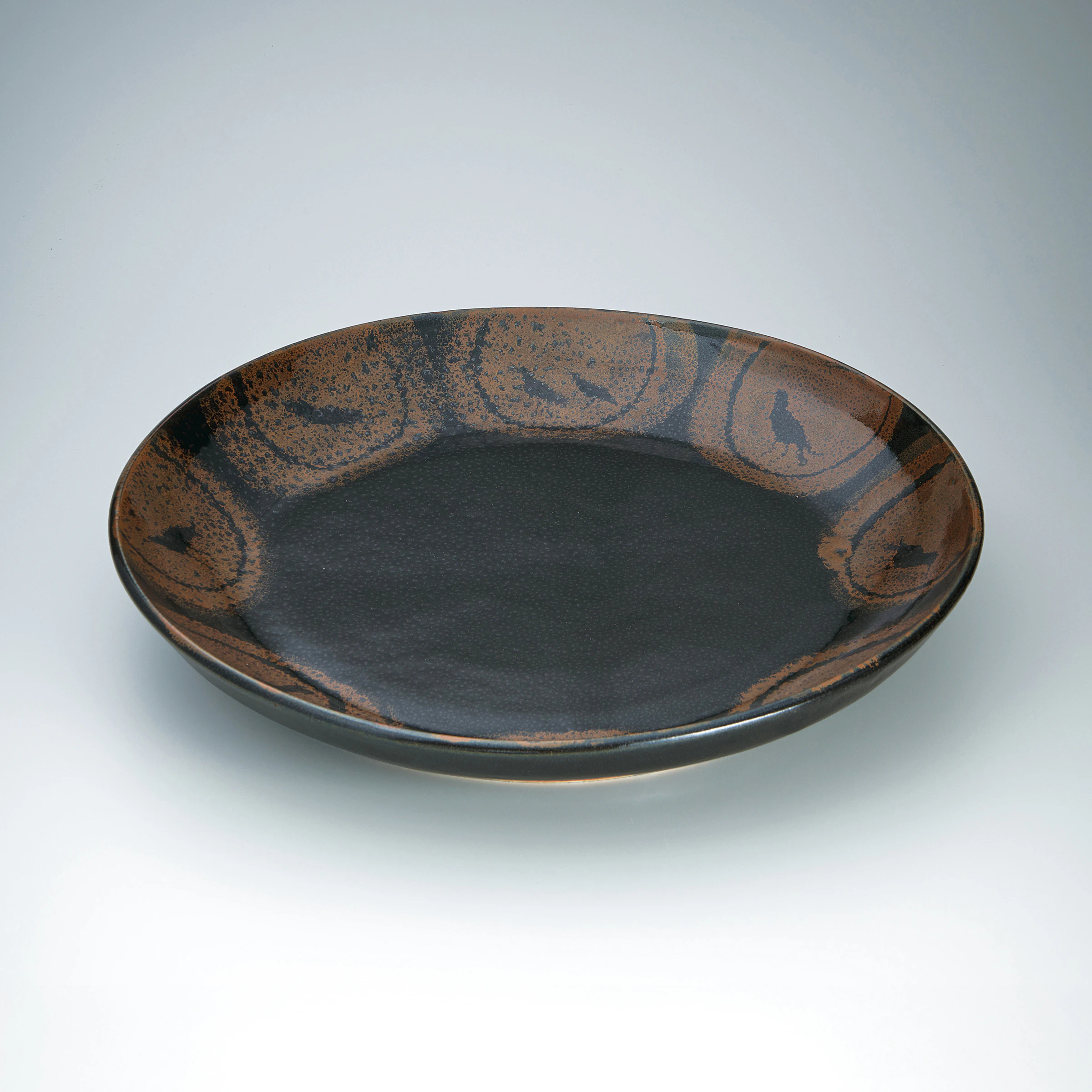 鉄釉とは、鉄を含む釉薬の総称です。鉄の含有量によって黒色、茶色、黒褐色、柿色などの違いが生まれます。なかでも、5%程度の鉄を含む黒っぽい釉薬は天目釉と呼ばれています。