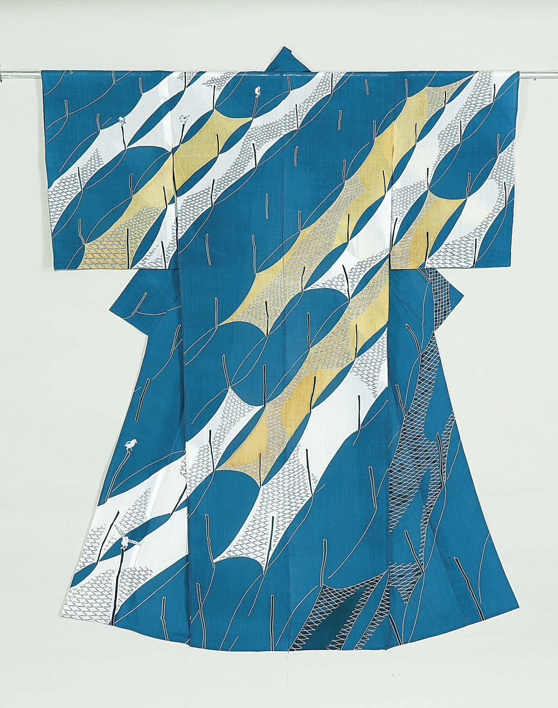 友禅染は日本を代表する染物のひとつで、白生地にのりで模様を描いて、いろいろな色を染めていきます。一度着物の形に仕立ててから青花液という、洗うと色の残らない液で下絵を描きます。その下絵の線の上にのりを置き、色どうしが混まざるのを防ぎます。そして、模様に合わせて色を塗ります。最後に、こののりを洗い流し、細く白い線を残すのが糸目友禅です。また、この白い線が残らないように模様を染める方法を堰出友禅といいます。